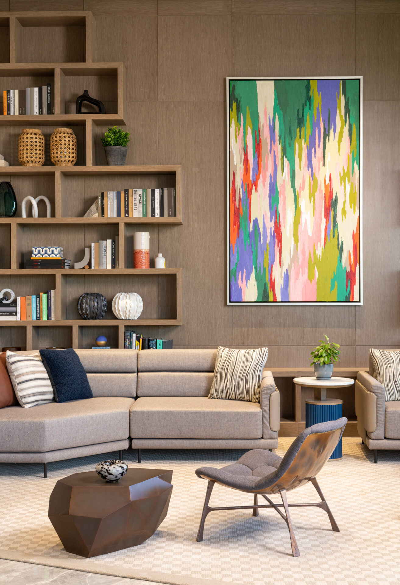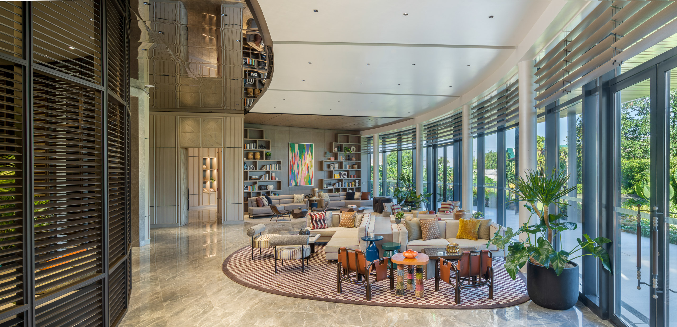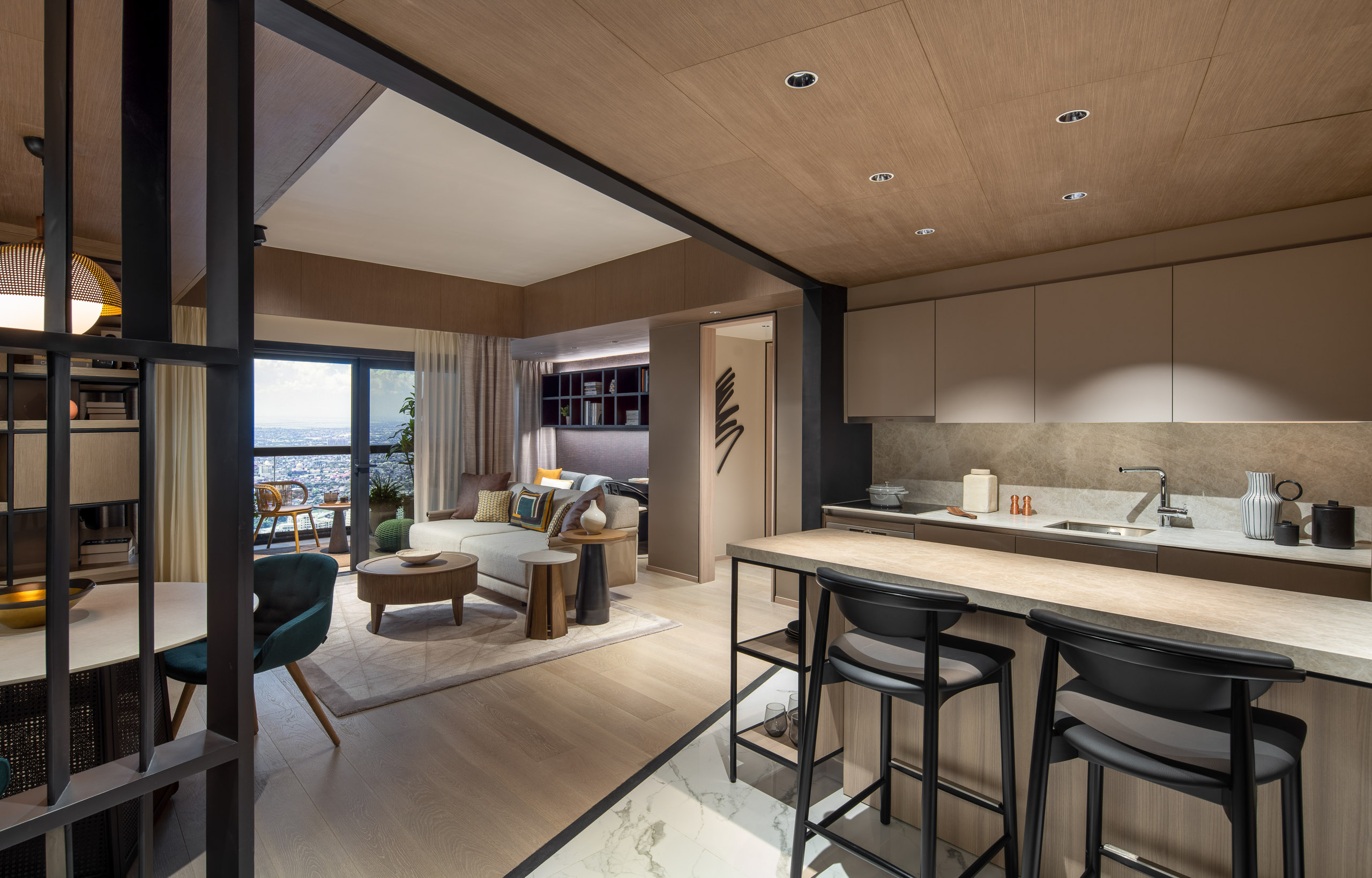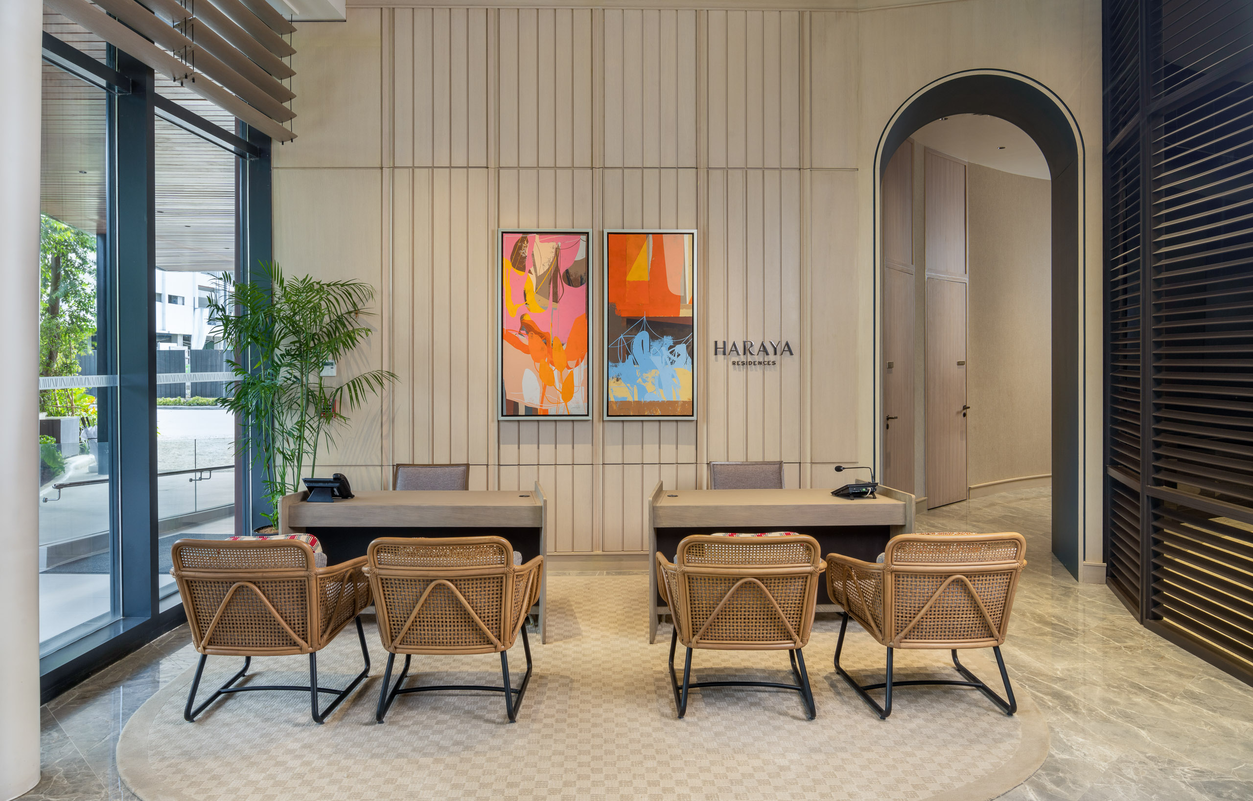 In designing the Haraya Residences Sales Gallery, FM Archittetura blended urban convenience with natural serenity to create a space that integrates modern urban life with a natural environment. The layout connects multiple areas to the loggia, providing options for office and gym spaces without sacrificing space elsewhere. This creates a fluid, open atmosphere that extends seamlessly to the loggia and terrace.